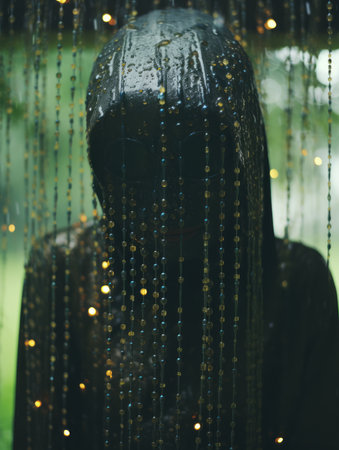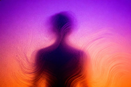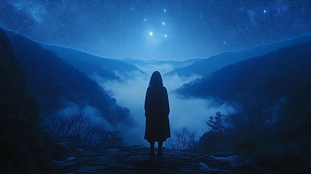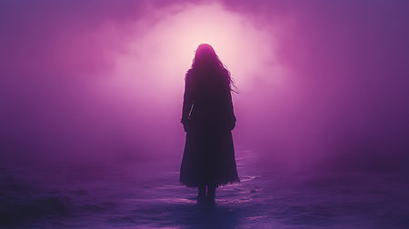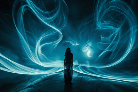 A captivating silhouette of a woman stands against a mesmerizing background filled with ethereal light and abstract shapes, evoking feelings of mystery and tranquility.