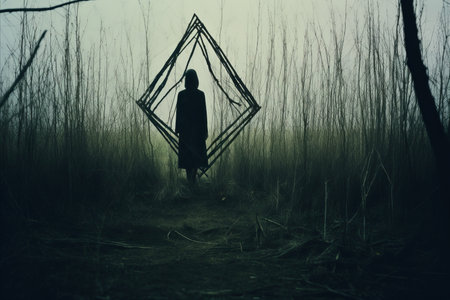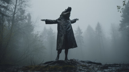 a person stands behind the bushes in the woods, creating a misty gothic atmosphere. this 8k resolution photo showcases dark green, otherworldly landscapes reminiscent of dramatic and somber religious works. with a touch of national geographic's aesthetic, the image is rendered in cinema4d, adding depth and realism to the scene. ai generated