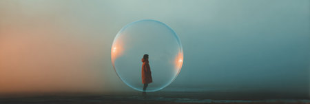 A person stands alone in a foggy environment, encased in a transparent bubble that creates a sense of safety and isolation from the surrounding haze.