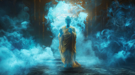 A captivating silhouette emerges from a dark background, enveloped in swirling blue smoke, evoking feelings of mystery and serenity within an atmospheric scene.