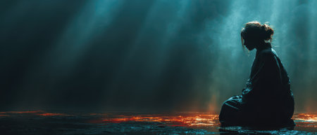 A solitary figure sits in deep thought near luminescent waters illuminated by soft rays of light in a tranquil mysterious setting.