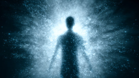 Abstract human silhouette surrounded by glowing blue particles and cosmic light, digital energy background