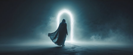 AI Generated. Mysterious figure walking toward an illuminated portal in a dark setting