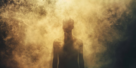 Silhouette of person in profile surrounded by golden atmospheric mist with dramatic lighting and soft shadows. High quality photo