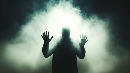 A figure stands against a backdrop of swirling fog, raising hands as if reaching out. The context is dark and mysterious, with an emphasis on the intense atmosphere of the moment.