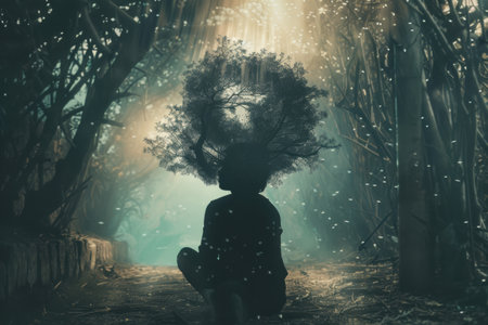 In a serene forest filled with lush greenery, a man stands silhouetted against a mystical background.