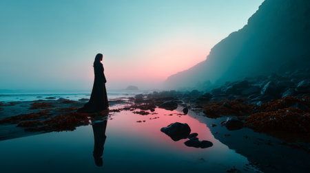 Woman in dark dress standing on a foggy coastal area during sunrise, surrounded by rocks and reflecting waters under soft pastel sky colors.