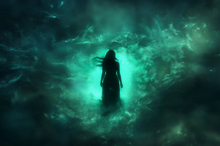 Silhouette of a woman with long hair floating in a glowing green underwater scene, creating a surreal and mysterious atmosphere