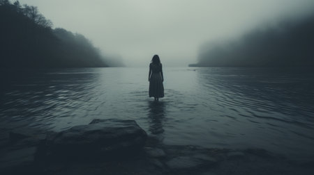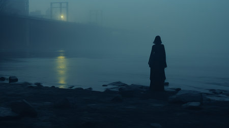 A lone figure standing on a mist-covered, melancholic dock. Moody atmosphere, misty environment, solitary person Generative AI