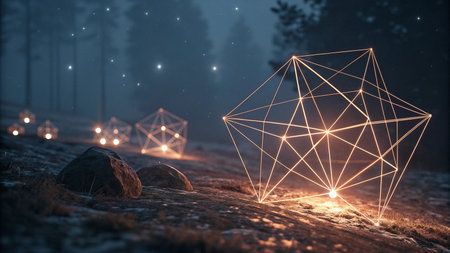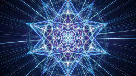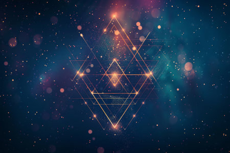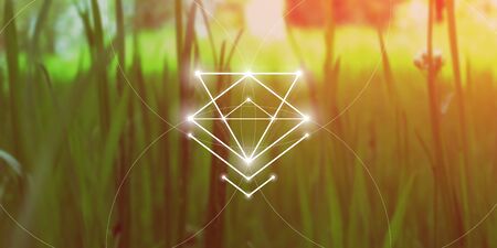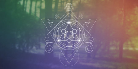 Merkaba sacred geometry spiritual new age futuristic illustration with interlocking circles, triangles and glowing particles in front of blurry natural photographic background