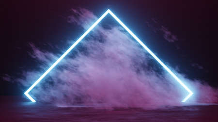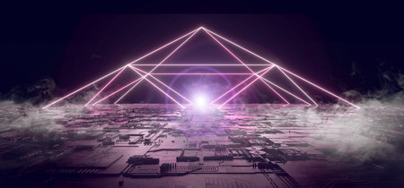 Smoke Fog Schematic Floor Texture Alien Spaceship Futuristic Pyramid Glowing Laser Beam Sci Fi Violet Purple Cyber Virtual Flare EMpty Background 3D Rendering Illustration