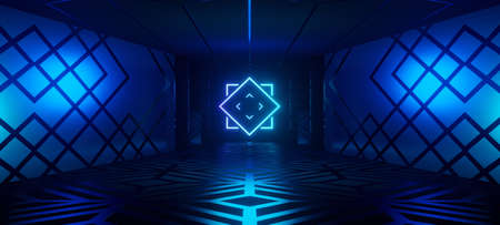 Neon Lights Glowing Vibrant Blue Corridor Grunge Concrete Dark Reflective Virtual Podium Garage Stage Udnerground Spaceship 3D Rendering