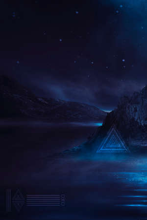 Neon landscape, night view. Futuristic fantasy night landscape with abstract landscape and island, moonlight, radiance, moon, neon. Dark natural scene with light reflection in water. Neon space galaxy portal.