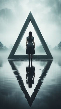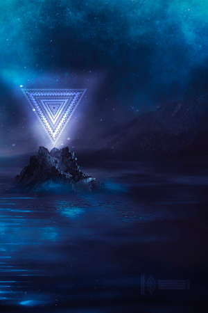 Neon glowing triangle frame floating on the water surface, sea water, 3D illustration