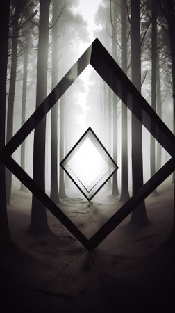 Abstract background with the image of the forest, mountains and the Metatron's Cube. Harmony, spirituality, unity of nature. Collage, mosaic.