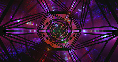 Vivid lights in shades of purple and green shine through a geometric structure, creating a captivating tunnel effect. This dynamic scene invites exploration and wonder at night.