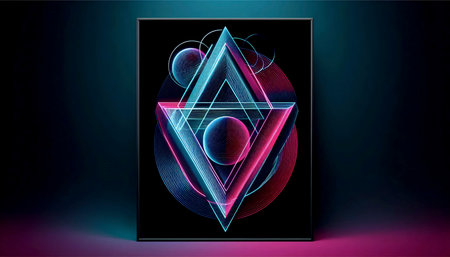 Bright geometric shapes glow in various colors, creating a captivating atmosphere in the art exhibit.