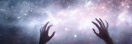 Hands extend toward a vast night sky filled with stars and colorful galaxies, creating a sense of wonder and connection to the universe.