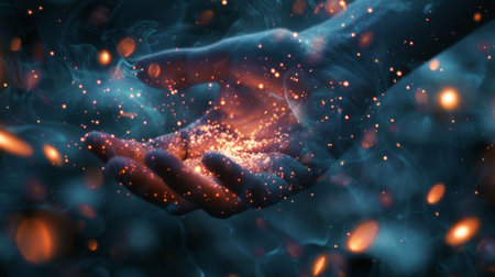 A hand holds glowing particles in a mystical, dark environment, symbolizing magic, wonder, and the power of imagination.
