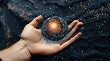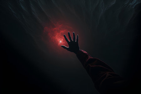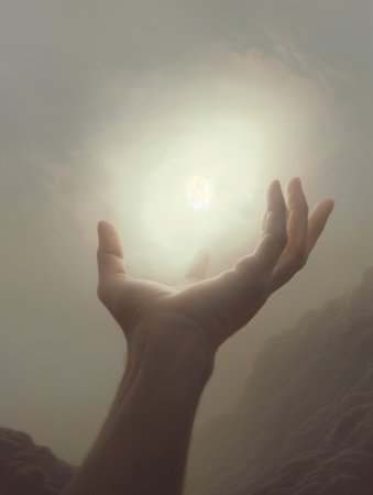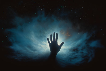 Mystical hand reaching for cosmic light, exploring spirituality and otherworldly connection