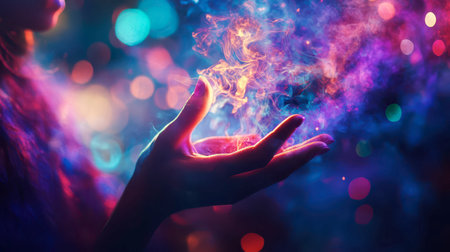 An outstretched hand captures a burst of light, symbolizing concepts of magic, power, and creativity. A.I.