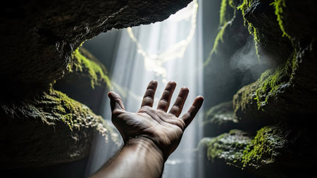 Close up of human hand reaching out from a cave. Mixed media