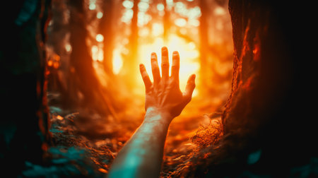 Hand reaching toward glowing sunset in a forest, symbolizing hope, escape, and yearning.