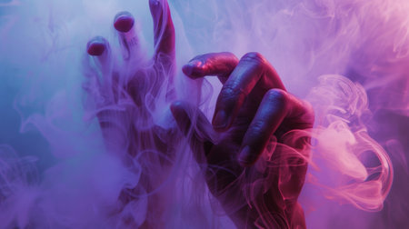 An abstract image of hands enveloped in colorful smoke with purple and blue lighting, creating a mysterious and artistic scene.