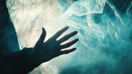 A dramatic and artistic silhouette of a hand reaching through swirling blue smoke, creating a mysterious ambiance.