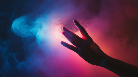 A dramatic composition of a hand reaching into colorful smoke, creating a surreal and vibrant visual.