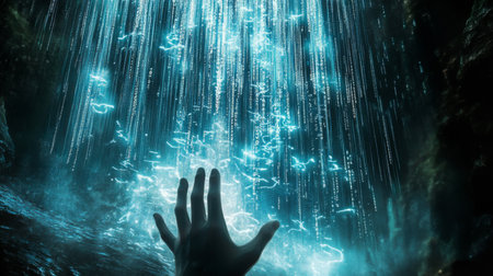 A hand reaching out toward cascading digital water in a surreal, illuminated cave