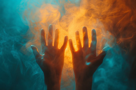 Mystical hands emitting orange and blue smoke on dark background create enchanting ethereal effect