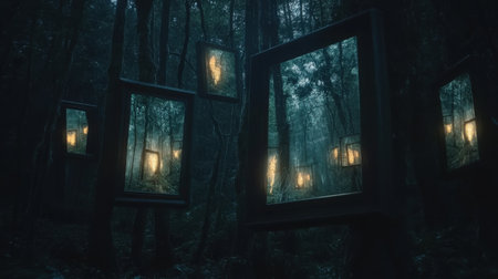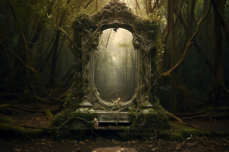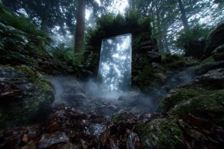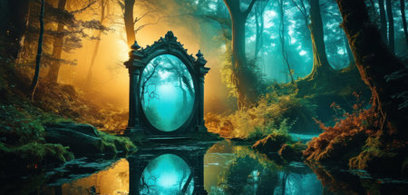 A mysterious mirror stands in an enchanting forest, partially shrouded in fog and surrounded by vibrant foliage.
