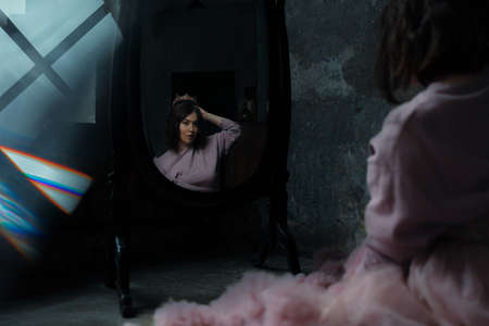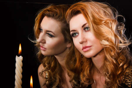 portrait of a beautiful young woman standing near the mirror looking at his reflection.