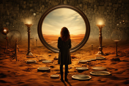 Woman in black dress with mirror in front of the sea: reflections between reality and introspection
