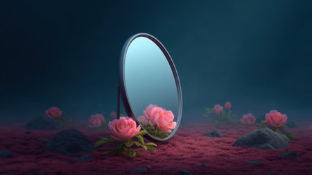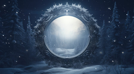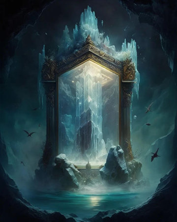 Fantasy scene with mirror and ice cave. 3D illustration.