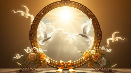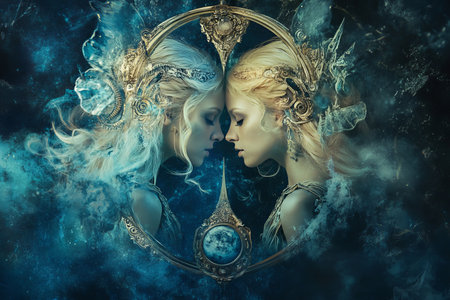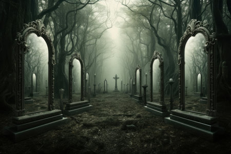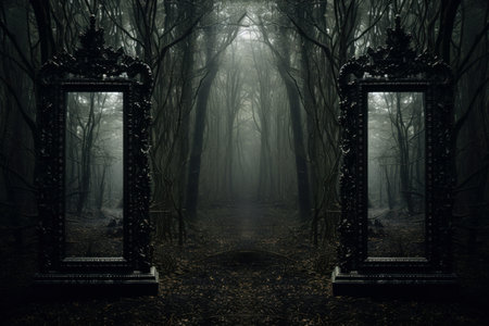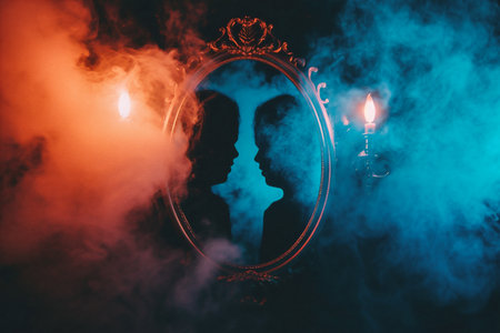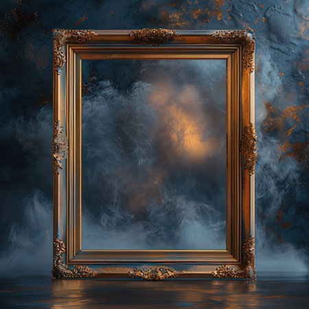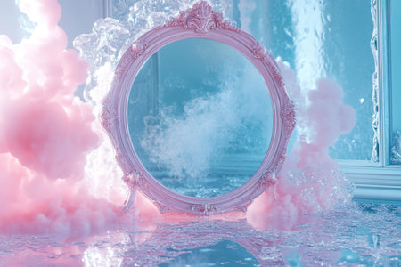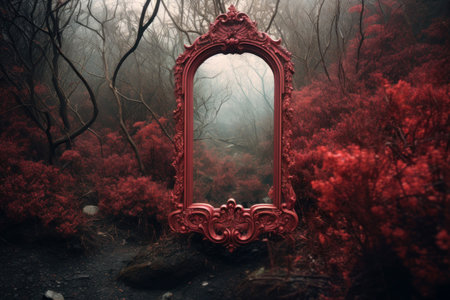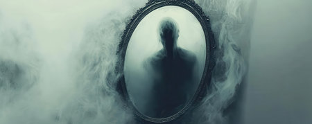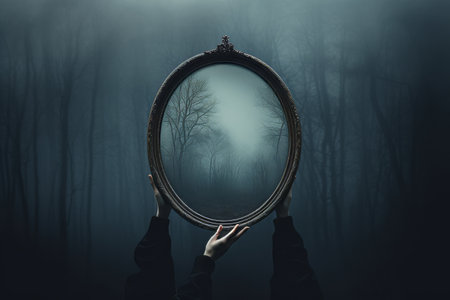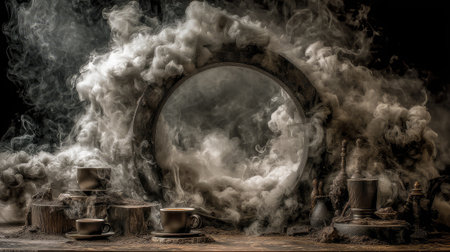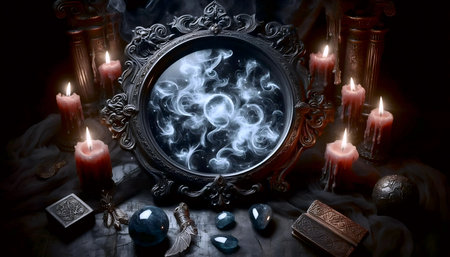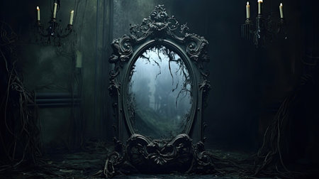 Ornate vintage mirror with smoke rising from its surface. Mystical object for fantasy design. Halloween, magic and mystery concept art.