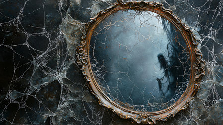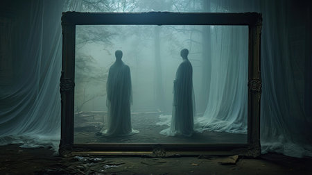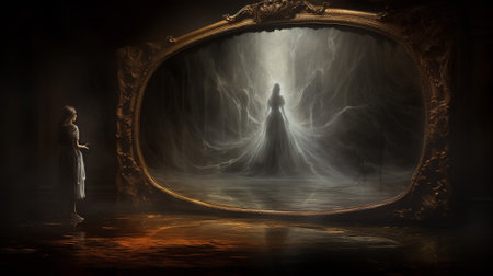 Horror movie scene with a creepy face in the mirror, dead bride in white dress looking reflection. Halloween scene
