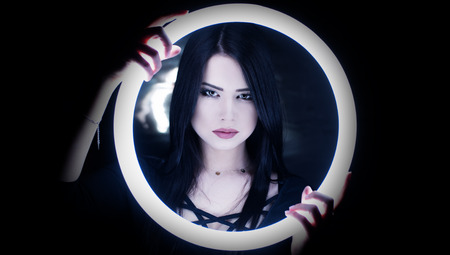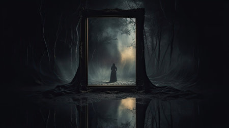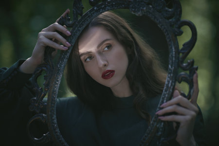 A charming fairy tale girl with dark wavy hair standing in a dark forest and looking through a magical frame. Fantasy, the heroine of a fairy tale.