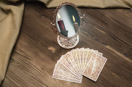 Tarot cards, mirror with reflection of candle on wooden table. Fortune teller. Paranormal desk table.