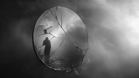 Reflective encounter in broken glass showcasing a thoughtful expression under natural light