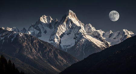 Snow-covered mountains illuminated by moonlight with dark sky and visible full moon creating a serene and dramatic atmosphere perfect for nature and travel marketing.