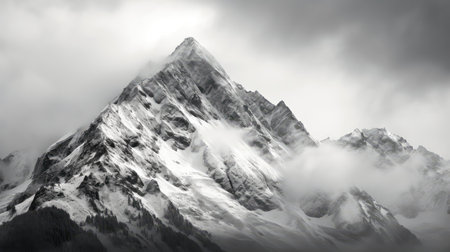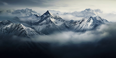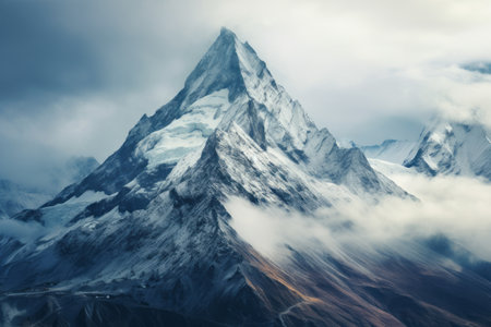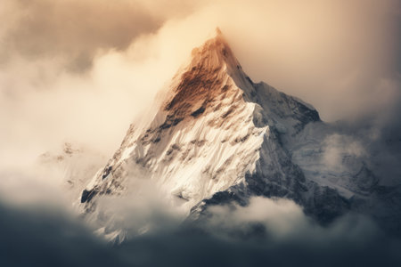 Majestic snow capped mountain peak piercing through a blanket of clouds, creating a dramatic and awe inspiring scene