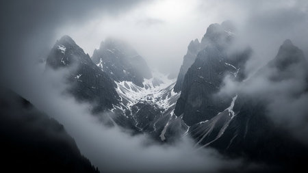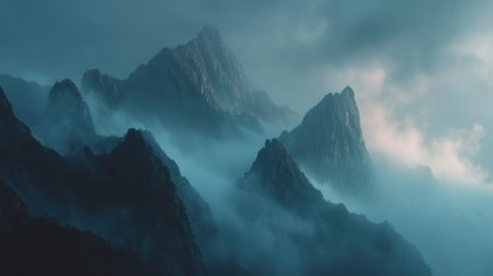 Captivating mountain landscape featuring dramatic peaks shrouded in mist and fog, creating an atmospheric and serene scene full of natural beauty and tranquility.