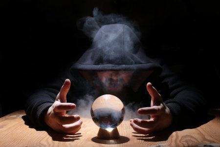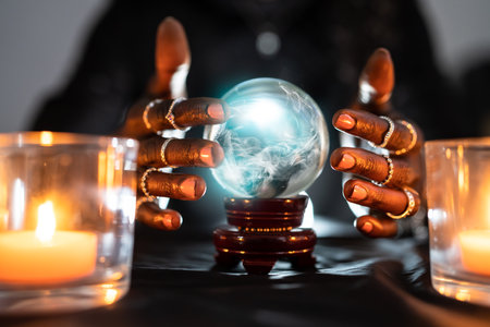 a fortuneteller in the salon read the future in a crystal ball and white stones in the smoke. horizontal photo