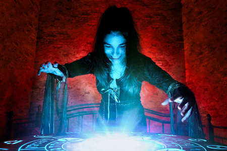 The witch conjures on a mysterious table in the stone basement of a mysterious house illuminated by blue and red light