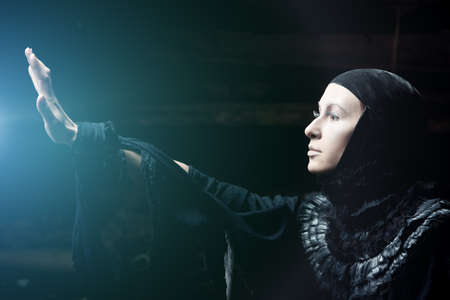 A girl dressed in black holds her palms out in front of her, her eyes on her palms. Selective Focus