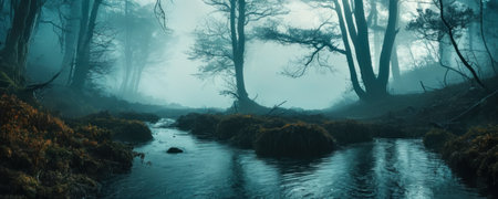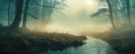 Calm river surrounded by foggy landscape showcases desolate trees and still water, creating a serene scene during the early morning.