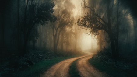 Mystical forest landscape with trees silhouettes in dark. Path in magical dreamy forest. Created with Generative AI