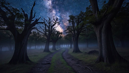 A dark pathway winds through a forest of tall, silhouetted trees, leading towards a breathtaking night sky. The image features a cool color palette with soft blue and purple tones, suggesting a night setting. The composition emphasizes depth, inviting viewers to explore the serene environment. Suitable for editorial and commercial projects.
